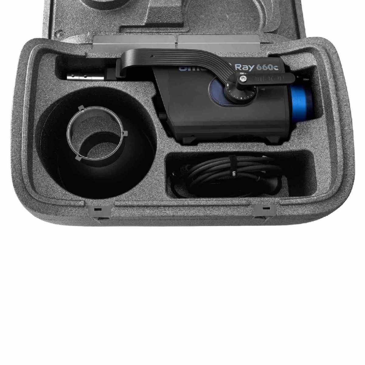 Die Ray 660c richtet sich an größere Studios, professionelle Filmsets und Außenproduktionen, bei denen deutlich mehr Lichtleistung benötigt wird. Sie eignet sich ideal für hohe Decken, große Softboxen, Fresnel-Optiken oder Szenen, in denen Licht über größere Distanzen wirken muss.