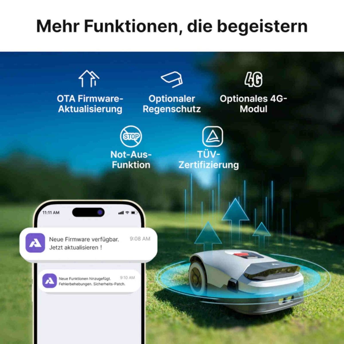Die Steuerung erfolgt komfortabel über die ANTHBOT-App, inklusive Zonenverwaltung für bis zu 20 Bereiche. Wetteradaptive Arbeitsplanung, Regensensor und eine IPX6-zertifizierte Wasserdichtigkeit machen den Genie 600 robust für den Dauereinsatz im Gartenalltag. Mit einem Geräuschpegel von nur 58 dB(A) arbeitet er zudem besonders leise. Die Akkulaufzeit reicht bei 2,5 Ah für ausgedehnte Mähzyklen.