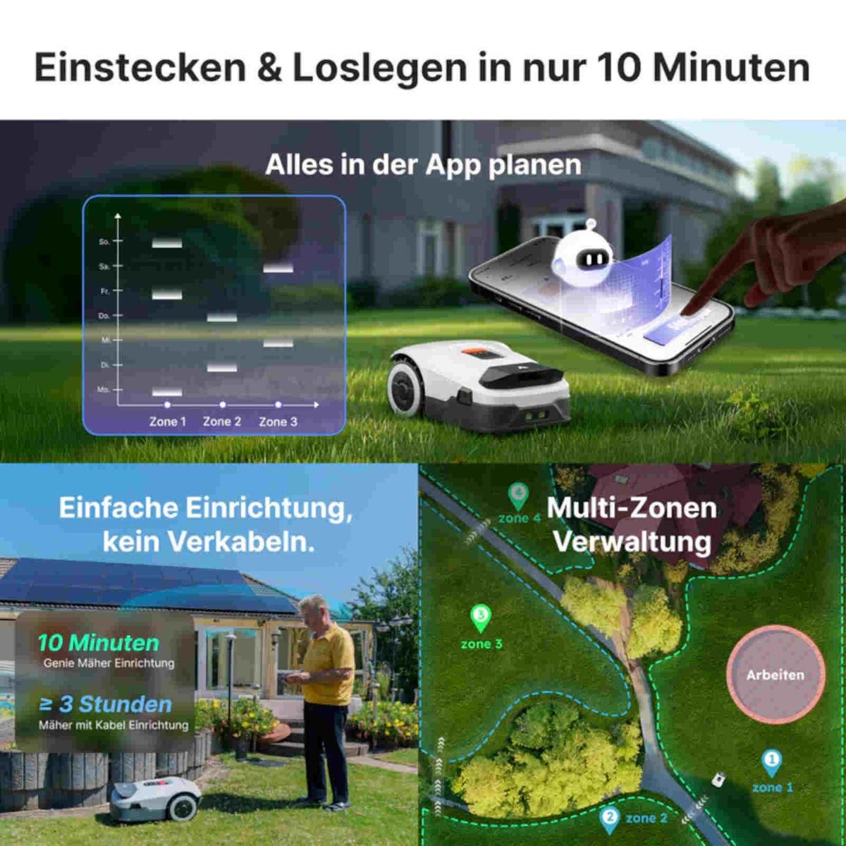 - Kabelloser Betrieb: Keine Installation von Begrenzungskabeln nötig