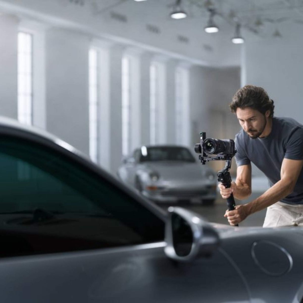 DJI RS 5 Gimbal mit montierter Kamera in freigestellter Produktansicht DJI RS 5 Kameragimbal mit montierter Kamera und Tracking-Modul in Studioansicht Seitenansicht des DJI RS 5 Gimbals mit montierter Kamera Lieferumfang der DJI RS 5 Combo mit Zubehör DJI RS 5 Kameragimbal in Studio-Umgebung für professionelle Filmaufnahmen Filmemacher mit dem DJI RS 5 Gimbal für dynamische Kameraführung bei der Aufnahmen von Fahrzeugen